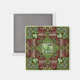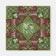 Um dragão estilizado fica no centro de um labirinto de nós Celtas, cor vermelha e verde-oliva, profundos. O dragão está preso no centro ou é o mestre do labirinto?