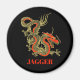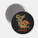 Um dragão chinês preto feroz esboçado em ouro decora este ímã. Acentos vermelhos destacam a mandíbula, a cabeça e a coluna do dragão. Seu nome está escrito em negrito ouro abaixo.