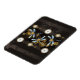 Marcadores e teclas antigas com engrenagens de ouro e latão, decoradas com libélulas mecânicas e boias em fundo castanho e listrado.