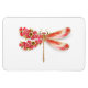 Articulado artificialmente, ouro, libélula joalhada com vermelho e asas decoradas com cereja japonesa vermelha, florescente e joalhada sobre fundo branco. Dourada Dragonfly.