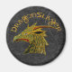Uma cabeça de dragões feita de metal-ouro e vidro verde - cercada pelo texto da fonte de fantasia de metal-ouro "Dragonslayer". Um presente perfeito para dragonlovers, fãs de arte de fantasia, jogadores de AD&D, jogadores de banda, jogadores de fantasia - para aniversários, natal, ou só porque!