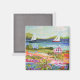Dois veleiros e algodão I por Karen Fields. Cena brilhante, divertida com flores, árvores, um chalé e veleiros na água.