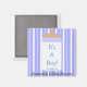 Anuncie a chegada do seu novo pacote de alegria ou use um favor perfeito para o chá de fraldas! Design apresenta um fundo de faixa azul e branca. No centro está uma garrafa de bebê com um anel de garrafa azul. No corpo da garrafa de bebê está o texto com uma fonte azul divertida que diz "É um menino com um lugar para adicionar a data de nascimento do bebê ou a data de chá de fraldas". Abaixo da garrafa de bebê está o texto na fonte da cinza escura que pode ser personalizado com o novo nome do bebê ou o nome da Mamãe a ser, se for usado como um favor de chá de fraldas.