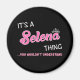 É uma coisa Selena que você não entenderia - tipografia de primeiro nome em letras mistas de letra branca e rosa. O nome cor-de-rosa na fonte decorativa é enquadrado em branco e tocado com uma coroa branca.