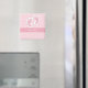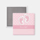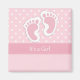 É uma garota salvando que o ímã é feito em azul com fundo branco de bolinhas e impressões azuis de pés de bebê.