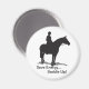 Os cavaleiros sabem como economizar energia — eles selam seus cavalos e montam! Magneta branca com silhueta preta de caça ao cavaleiro inglês em cavalo e Salve Dinheiro... Saddle!