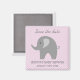 Elefante de cinza Salve a imã de geladeira de chá de fraldas de data. Design de animal de zoológico bonito com fundo bolinhas rosa e branco. Adicione seu próprio nome de filho e data. Polkadots impressão com modelo de texto de cinza. Ilustração do tema da selva/safari para garotas ou garotos da festa de babá.