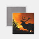 Um alce fica em cima de uma colina como um incêndio selvagem se estende atrás dele. A silhueta dele se destaca nitidamente contra o fogo no fundo. Computação de Kathie Miller.