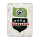 Uma ilustração em forma de café a vapor, em preto e branco, fica em forma verde de ervilha sobre estrelas pretas e brancas, grandes pontos vermelhos e um fundo texturizado branco.