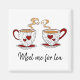 Íman admirável com dois teacups sentados confortavelmente sob o vapor de coagulação, decorados com bolinhas e corações vermelhos. "Encontre-me para o chá" em escrita decorativa por baixo.