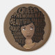 Esta design apresenta "Rainha, fenomenal, bela, inteligente, mágica, chefe, amorosa, sexy, independente, engraçada, criativa e forte" aninhada em sua afro preta, com colares em camadas de ouro sobre fundo castanho.
