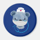 Um ímã com uma bela ilustração de um urso azul vestindo um chapéu de enfermeira com um pequeno coração nele. Também vestindo uma máscara protetora e tem um estetescópio azul.