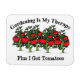 Tomates são uma base para a maioria dos jardineiros e nenhum de nós pode esperar por essas suculentas frutas vermelhas. Design gráfico divertido com uma fileira de tomateiros cercada pelo texto Gardening is My Therapy Plus I Get Tomates