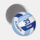 Este ímã temático de vôlei esportivo para rapazes ou raparigas apresenta a imagem realista de um vôlei azul claro e escuro e branco sobre o qual pode personalizar o nome do jogador & número de camisa mais nome da escola ou do clube e nome de mascote numa letra estilo varsity - por katz_d_zynes