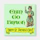 Erin Go Braugh Feliz Rua. Dia de Patrick dizendo com a arte safena de um irlandês no terno vitoriano verde bebendo brinde com um cálice prateado, uma faixa amarela diz "Ruas Felizes. Dia de Patrick" em letras verdes.