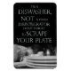 Um simples design para chamar a atenção da sua casa para o uso adequado da máquina de lavar louça. O texto diz: Eu sou uma máquina de lavar, não um desintegrador de comidas; Não se esqueça de raspar seu prato.
