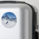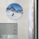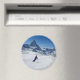 Imã fotográfico redondo com uma esquiadora fêmea nas encostas da montanha Matterhorn através de neve fresca num belo dia com um céu azul claro na estância de esqui Zermatt, cantão Valais na Suiça.
