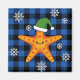 Uma ilustração de um bonito desenho animado, o peixe-estrela laranja kawaii, vestindo um chapéu de santa verde rodeado de flocos de neve para o Natal em um padrão de búfalo preto e azul. Essa vida marinha em um design de controle é uma ideia de presente para amantes do Natal, amantes do Papai Noel e amantes do oceano.