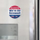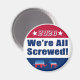 Não está satisfeito com nenhum dos candidatos às Eleições 2020? Então esta design é para você. Este design circular apresenta seções vermelhas, brancas e azuis. A parte vermelha superior tem o ano 2020 entre duas estrelas todas em branco esboçadas em azul. A seção de centro branco tem texto que diz, "Estamos todos lixados!" em texto azul esboçado em vermelho, e a seção de baixo azul tem um burro estilo Democrata e um elefante estilo Republicano esboçado em branco.