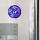 Este ímã está agarrado à minha imagem fractal roxa e azul de uma estrela de cinco pontas numa espiral de cor envolvente; tudo sobre um fundo escuro.