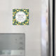 Um ímã favorito com um padrão fofo que apresenta limões amarelos e fruta verde-limão com pedúnculos de folhas sobre fundo verde-escuro.