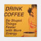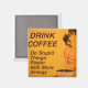 Uma mulher sorridente com batom vermelho retrorado e unhas bebe sua xícara de café da manhã. A legenda diz "Beba café - Faça coisas estúpidas mais rapidamente com mais energia."