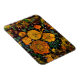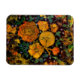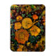 Esta imagem vibrante é uma combinação de uma pintura e arte digital. Ela apresenta flores brilhantes, ouro-amarelas e laranja com texturas intrincadas, semelhantes à web. As flores se assemelham a rosas e outras flores, cercadas por um emaranhado de caules e folhas neonatais em tons de verde, laranja e vermelho. O fundo é escuro, quase negro, que melhora o efeito luminoso das flores e da folhagem. Há também luzes minúsculas, cintilantes, semelhantes a estrelas espalhadas por toda parte, acrescentando uma sensação mágica ou cósmica.