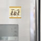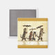 Este ímã quadrado tem uma família de gatos de dois gatos adultos marrons e dois gatinhos todos guarda-chuvas de carregando enquanto caminha na neve sobre um fundo amarelo pálido com bordas de ouro no topo e no fundo.