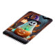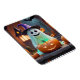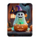 Uma imagem tridimensional de um fantasma vestindo um chapéu de bruxa roxo. O fantasma tem um sorriso grande e está segurando uma abóbora. Há outras abóboras ao redor do fantasma, algumas com rostos entalados neles. O fundo é uma casa assustadora com morcegos voando. O esquema de cores é predominantemente laranja.