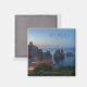Fotoímã de Souvenir com as grandes rochas de Faraglioni na água do Mar Mediterrâneo e a antiga fábrica de atum vermelha de Scopello, na costa norte da Sicília, Itália, na Hora Azul do anoitecer, com o texto "Scopello, Sicília".