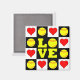 An adorable square decorative fridge magnet for fastpitch softball players, coaches, teams and fans. Featuring a black and white checker pattern with bright yellow softballs on the black squares, and bright red hearts on the white squares, with LOVE printed in bold letters in the center and a softball in place of the O.