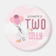 Divertido e divertido ganso magnetos redondos para o seu grande dia. Este design "Dois Bobos" apresenta um ganso branco feliz flutuando com balões cor-de-rosa contra um fundo do céu suave. Personalizado com o nome do seu filho para torná-lo uma combinação perfeita para uma segunda festa de aniversário temática ganso-bobo. Este ímã redondo faz um presente simples, fácil, pronto para ir, a favor da festa.