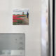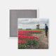 Fotoímã de Souvenir de um agricultor que veste sapatos de madeira amarelos inspecionando as suas tulipas vermelhas, com ao fundo um moinho de vento tradicional em primavera na Região do Bulbo das flores, nos Países Baixos.