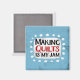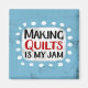 "Fazer Quilts Is My Jam" é um design de texto bonito, em azul, com texto preto e vermelho, junto com uma forma de sotaque branca e pontos brancos texturizados ao seu redor.