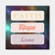 Fé, esperança e amor: as três virtudes teológicas, lançadas pela Rua. Paul o Apóstolo, em sua famosa carta à Igreja em Corinto. "E agora esses três permanecem: fé, esperança e amor. Mas o maior deles é o amor." presente de excelente para a sua família cristã e amigos que gostam de partilhar a sua fé com os outros. Estrelas e fundo de galáxia.