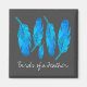 design de penas azuis bonito de cor azul de madeira contra fundo de cinza escuro. Belo design azul profundo com uma vibração. Aves de uma citação de pena