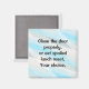 Este ímã diz: "Feche a porta corretamente, ou coma carne mimada de almoço. Sua escolha," contra um design de fundo abstrato de matizes azuis e beges. Um lembrete amigável — ou um aviso — para aqueles que tendem a sair e permitir que o frigorífico "feche" por si próprio (o nosso não.)