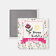 Um imã feliz de aniversário personalizado com um quadro quadrado com uma borda cor-de-rosa que diz "Parabéns" escrito em uma letra de moda com um sol amarelo acima e uma flor rosa bonito. Uma fita rosa com um nome personalizado ou outro texto abaixo. O pano de fundo é um padrão uniforme, com flores silvestres rosa desenhadas à mão, com caules longos e folhas verdes sobre um fundo branco de casca de ovo. Círculos cor-de-rosa e galhos também decoram o design. Design bonito e de verão.
