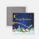 Bonitas paisagens de neve com árvores de Natal, casas, um homem de neve, e um arco-íris sobre a neve caindo do céu. Papai Noel e uma rena caminhando juntos para distribuir presentes de Natal na noite de Natal.