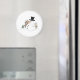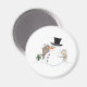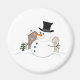 Ilustração de um boneco de desenho animado de Natal em uma cena de neve com casas cobertas de neve e uma árvore ao fundo.