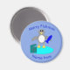 Este incrível ímã apresenta uma pequena cinza e um pinguim branco com olhos escuros e bico e pés amarelos. O pinguim está segurando um peixe grande azul com uma nadadora e parado em um pedaço azul pálido de gelo. Há um presente aberto ao lado do pinguim completo com uma fita festiva.