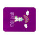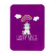Um ímã flexível com uma bela ilustração de um unicórnio branco sentado no seu rabo sorrindo e parecendo feliz. Nuvens sorridentes e um arco-íris. Texto diz: Feliz Víblias. Imagem de uplifting adorável. Com um fundo de aquarela púrpura rosado.