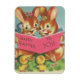 Este adorável ímã apresenta uma ilustração antiga de dois coelhos segurando um livro cor-de-rosa que diz "Felz pascoa para você", cercado por flores e um casal de pintinhos de bebês enquanto um pássaro azul canta junto.