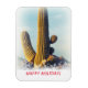 Fotografia do cacto saguaro com cobertura de neve e flocos de neve e personalizáveis "Feriados Felizes" em letra vermelha de traçado de pincel.