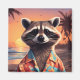 Engraçado Raccoon vestindo uma camisa havaiana em uma bela praia.