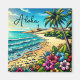 Aloha! Bonito costa tropical costeira. Bonito água azul, palmeiras, flores tropicais e um farol no fundo. Ai arte feita no estilo de pop de quadrinhos.