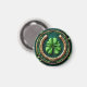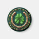 Ilustração vibrante que retrata uma ferradura dourada emparelhada com um trevo de quatro folhas exuberante e videiras verdes decorativas simbolizando sorte, prosperidade e natureza.