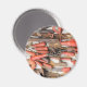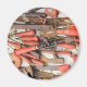 Uma coleção de ferramentas antigas antigas e vermelhas manipuladas em uma mesa num mercado de pulgas.