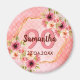 Um ímã moderno e feminino para uma festa de 90 anos. Com uma moldura geométrica hexagonal em dourado falso. Decorado com flores de dália pintadas à aguarela em rosa, creme e coral. Fundo colorido coral vivo com bolinhas. Modelos para nome, idade 90 e data. Data de nascimento ou data da festa. Letras cor burgundy e coral. Perfeito como lembrança, recordação ou lembrete save the date para seus convidados.