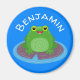 Este sapo verde giro e feliz sentado em uma almofada de lírio roxa é brilhante e adorável. Muita diversão anfíbia desenhada no estilo de animação feliz.